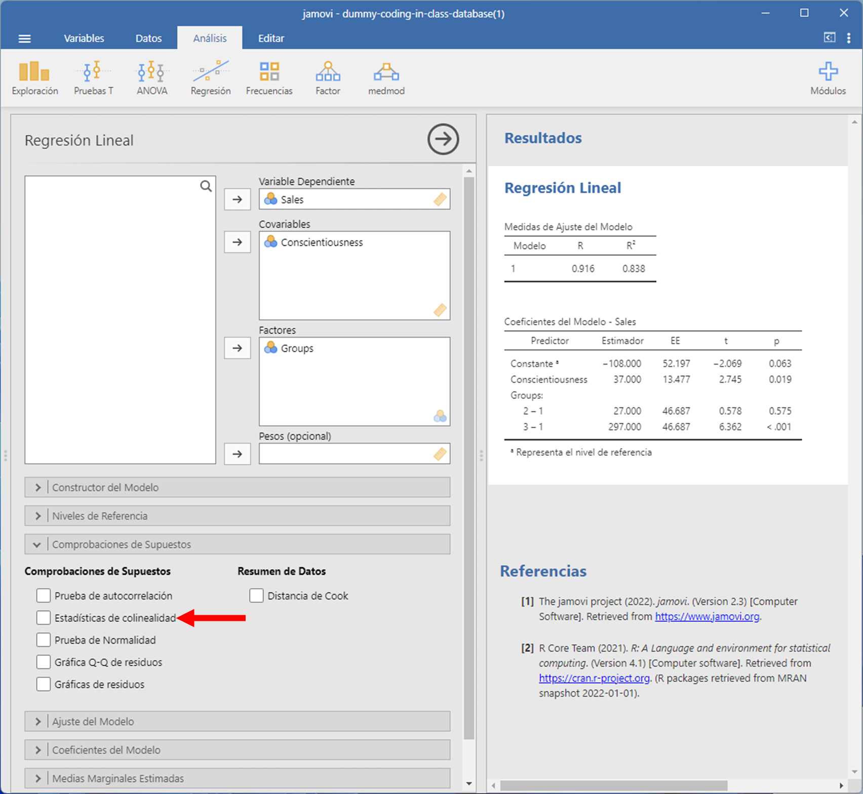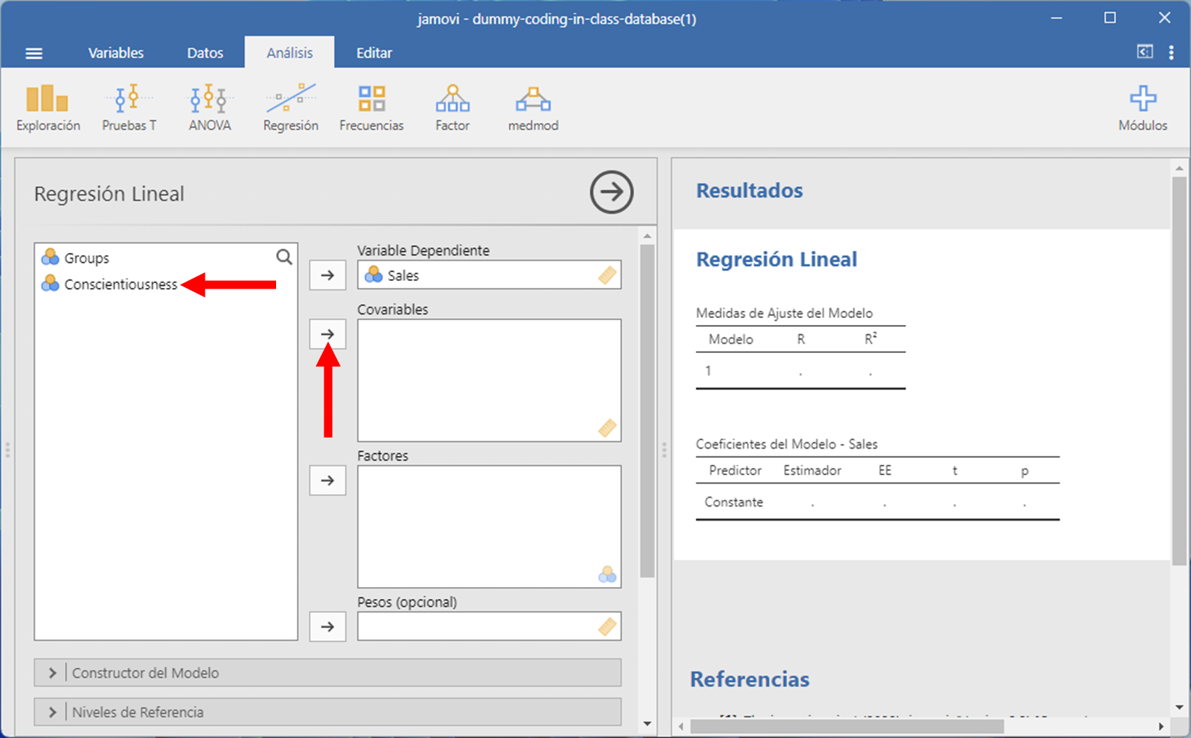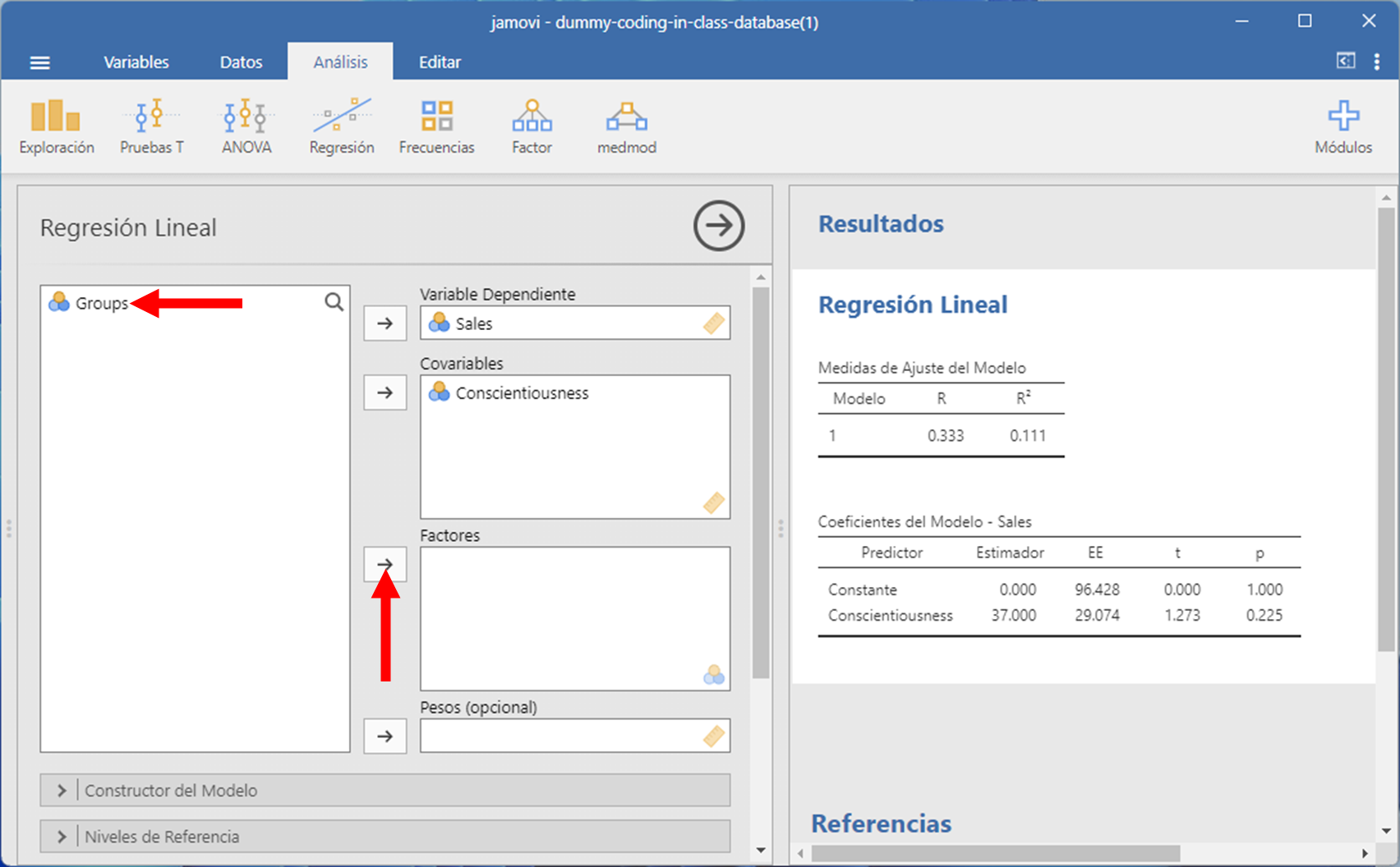 Incluyamos nuestra variable categórica como predictor, que es grupos en este ejemplo. Normalmente, habríamos necesitado crear variables dummy para esta variable categórica en otros programas estadísticos; sin embargo, Jamovi puede crear automáticamente estos variables dummy por nosotros. Haga clic en su variable de grupos, y haga clic en la flecha hacia la derecha junto a la casilla “Factores”.