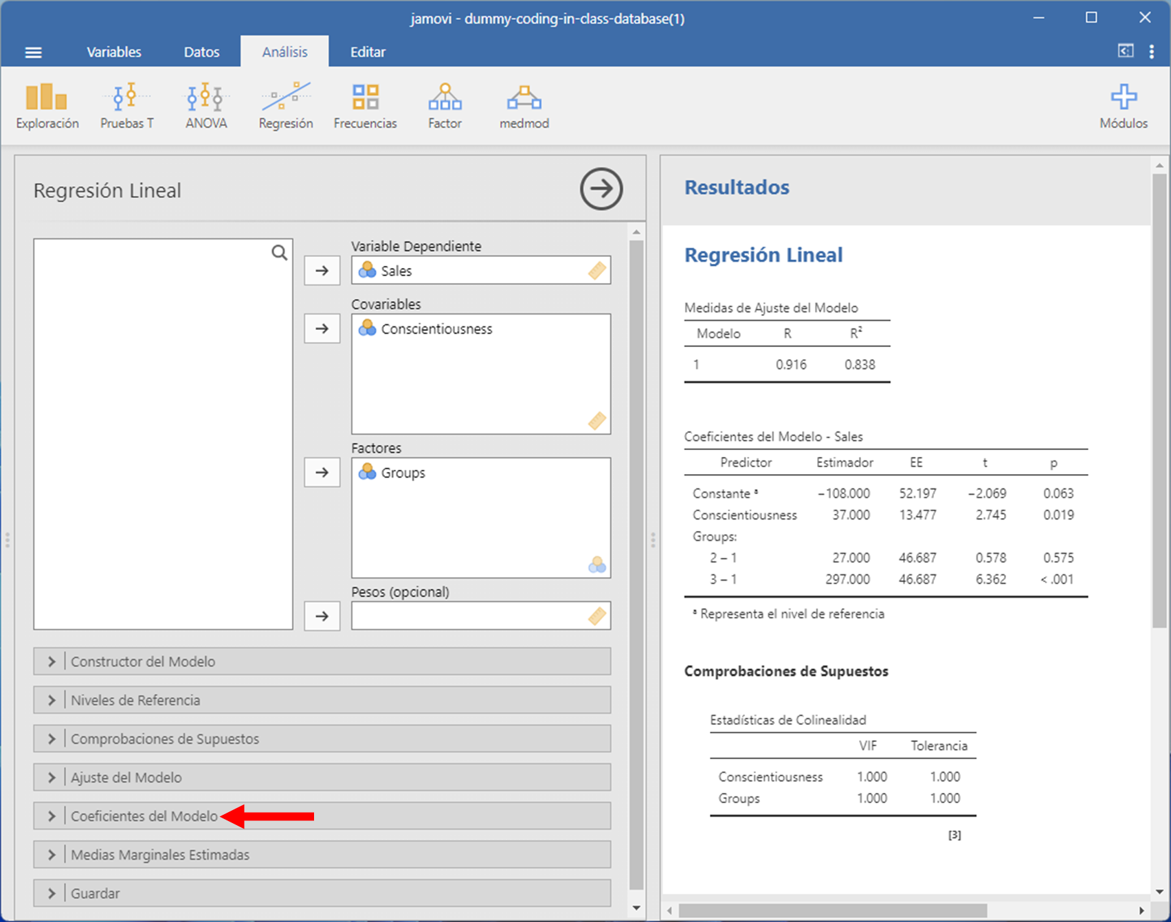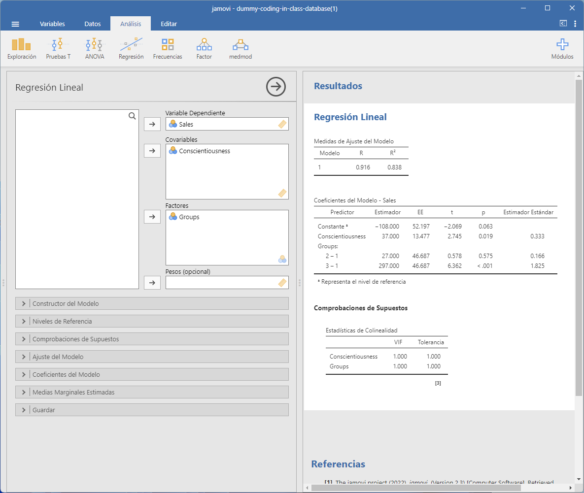 Imagen Regresión con Variables Dummy en Jamovi 9