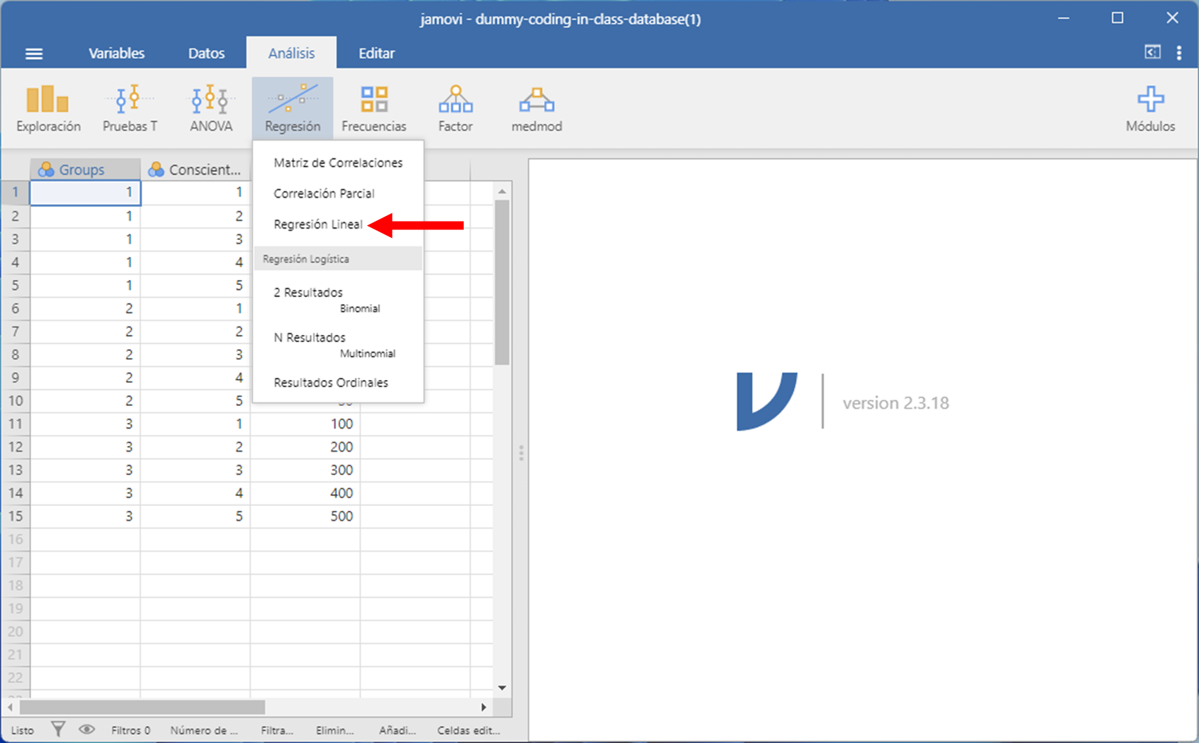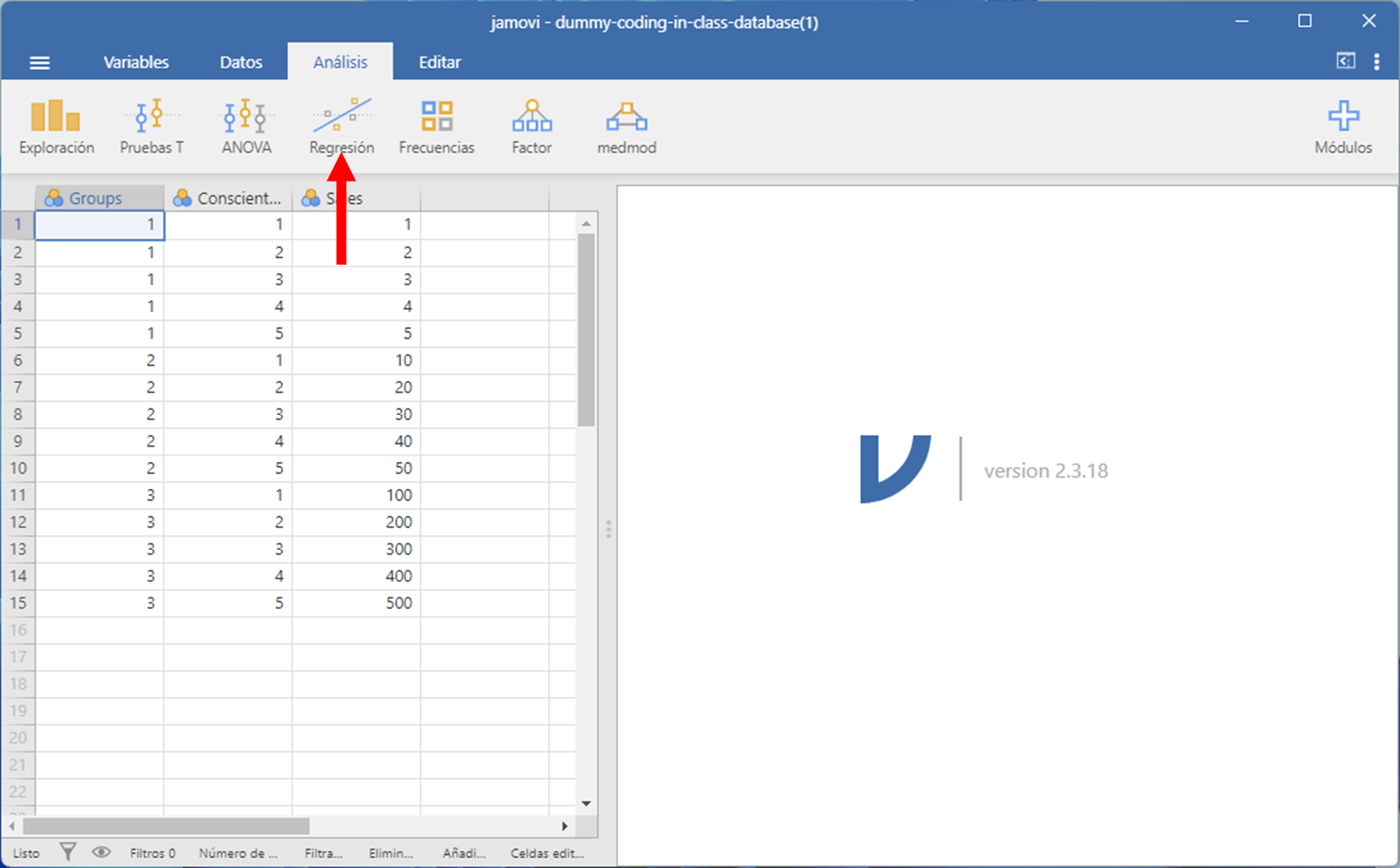 Así, podemos proceder directamente a realizar el análisis. Para ello, primero hacemos clic en el botón “Regresión” en la parte superior de la pantalla.