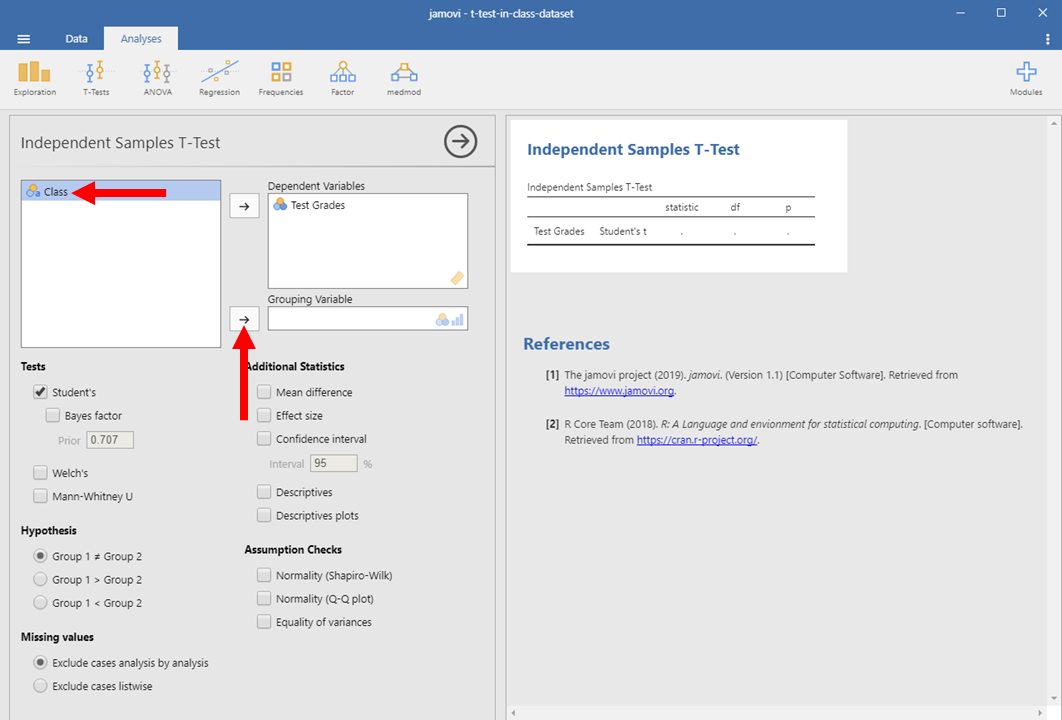 Then, we want to designate Class as our grouping variable in Jamovi. To do so, we want to click on Class and the click on the right-facing arrow next to the “Grouping Variable” box.