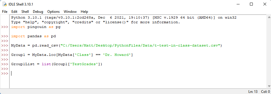 Group1 is now a reduced dataset of only Dr. Howard’s students. To make a list of only Dr. Howard’s test grades, let’s first name it by typing: Group1List = . Then, to make Group1List a list of only Dr. Howard’s test grades, type the following: list(Group1[‘TestGrades’]) . Press enter.