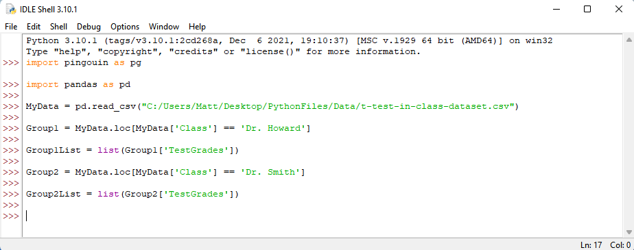 To create the first list, we should create a variable named Group1 by typing: Group 1 = . Then, to get the data of only Dr. Howard’s course, we should type: MyData.loc[MyData[‘Class’] == ‘Dr. Howard’] . Press enter.
